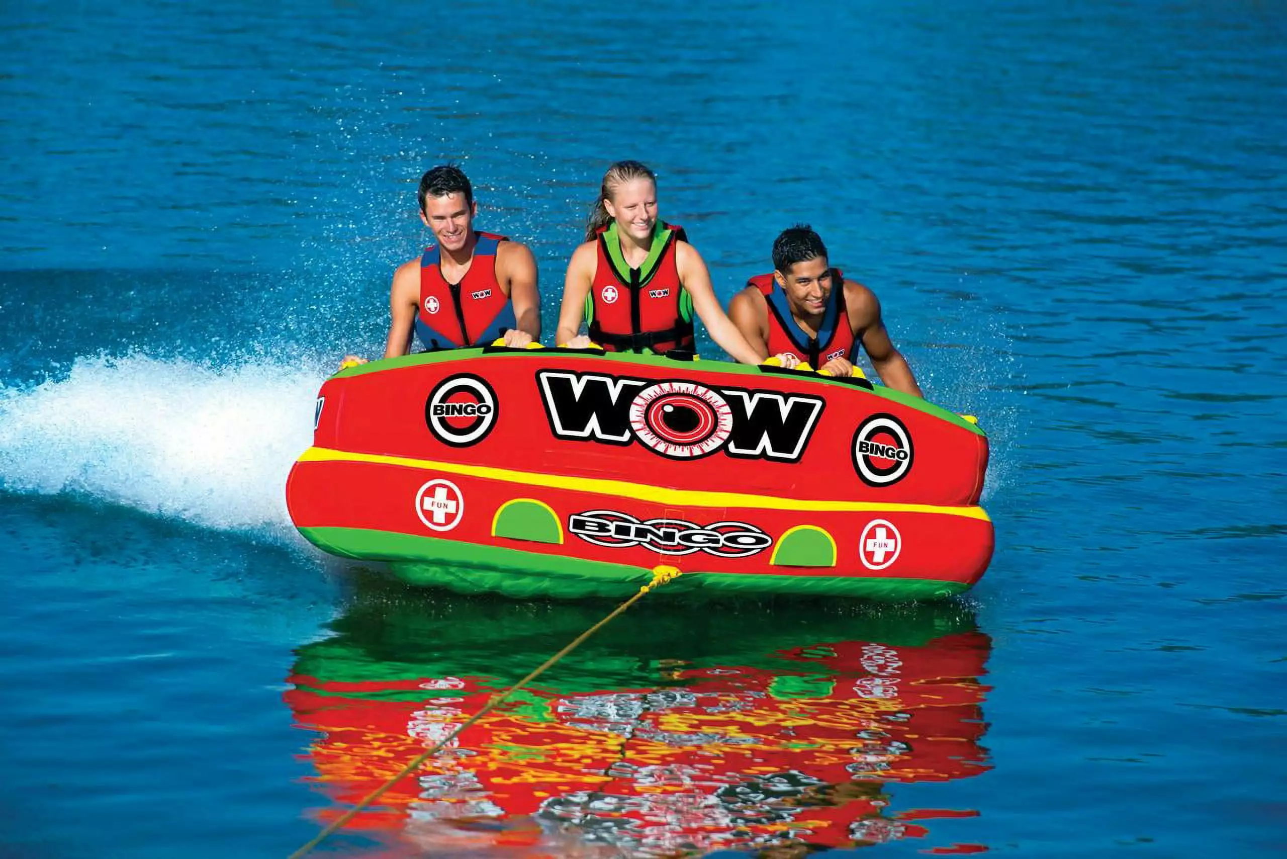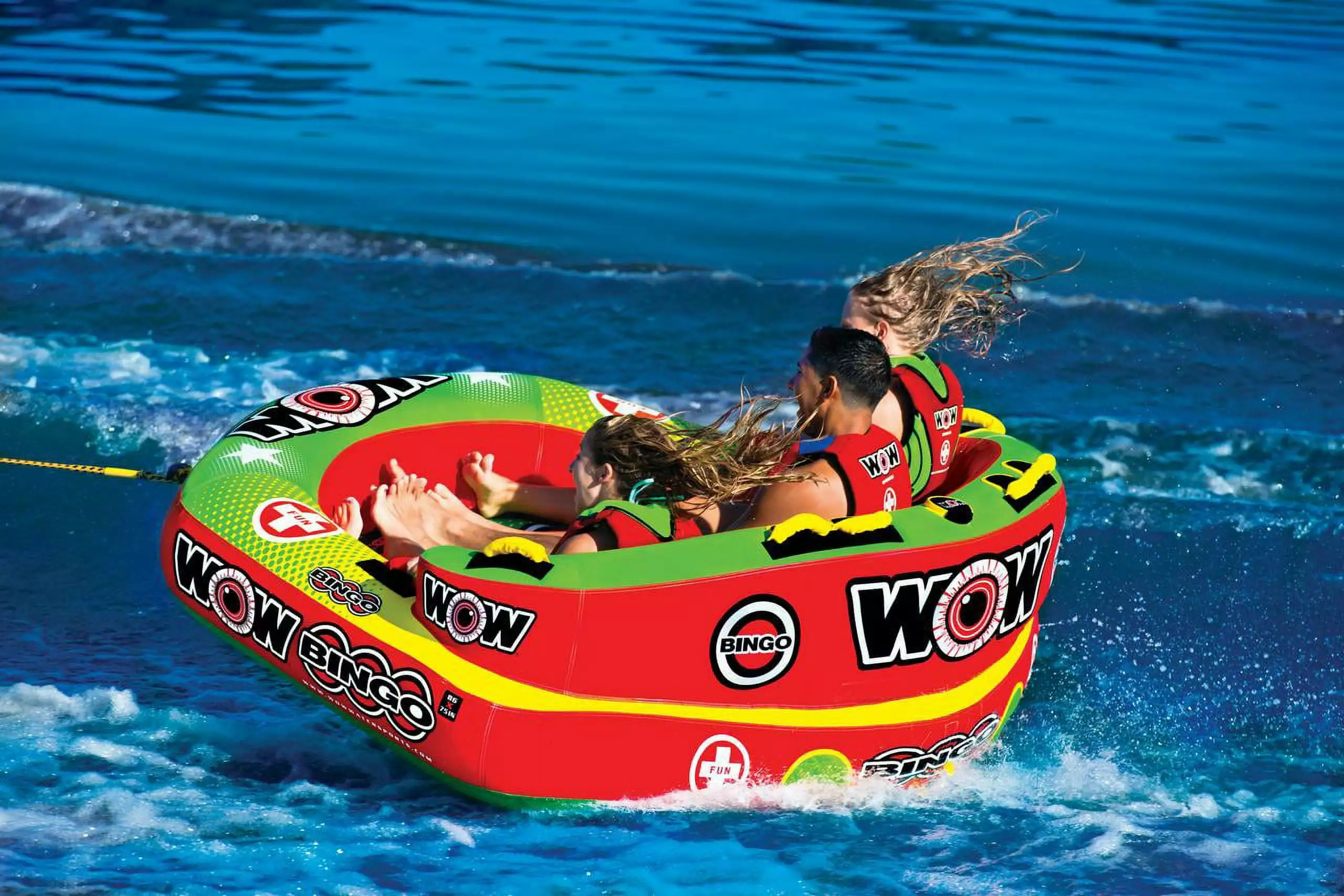 The Bingo 2 was specifically designed with family fun in mind. Another original design from WOW. this action packed towable gives your family 2 rides for the price of 1. The Bingo tubes are the only cockpit tubes on the market with front and back tow points. Ride in the seated position from the front tow point or connect the rope to the back tow point and ride chariot style. The Bingo comes with a free 11" 4K EZ tow connector which makes it simple to switch tow points even while on the water. The deep cockpit seating with high backrest makes the riders feel more secure while the new drop speed bottom glides smoothly over the water creating less drag on the boat and therefore better gas mileage. The Bingo 2 will be loved by everyone in the family; from those that like a nice and easy ride to those that want something more extreme.