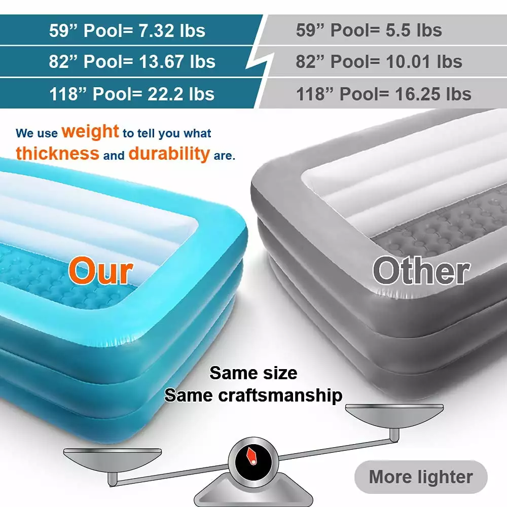 - Safe & Soft Inflatable Floor: Kids swimming pool is made of high-quality and standard-compliant vinyl materials. and the thickness is 125% of the same size pool to ensure safety. The double-layer and inflatable bottom are not easy to leak. It provides the child with a super soft and comfortable feeling and increases the protection of the child when playing.