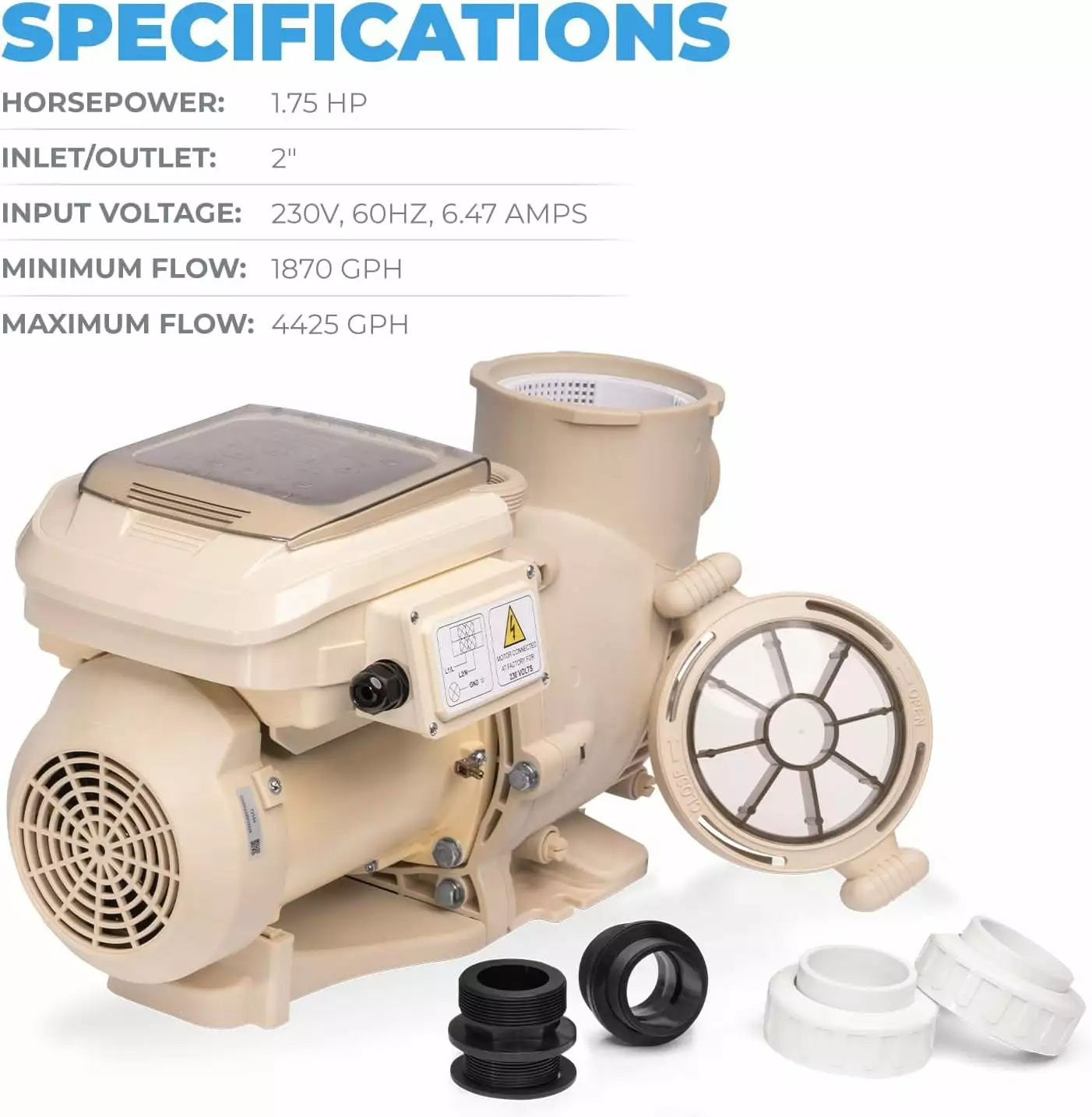XtremepowerUS 1.75HP Variable Speed Swimming Pool Pump for Inground Pools. High-Flo 230V. 6.660 GPH with 2" Fitting Included. This pool pump is specially designed for all types and sizes of in-ground pools and spas. It allows custom programming of optimal pump speeds for tasks such as filtering. cleaning. heating. spa jets. and waterfalls.