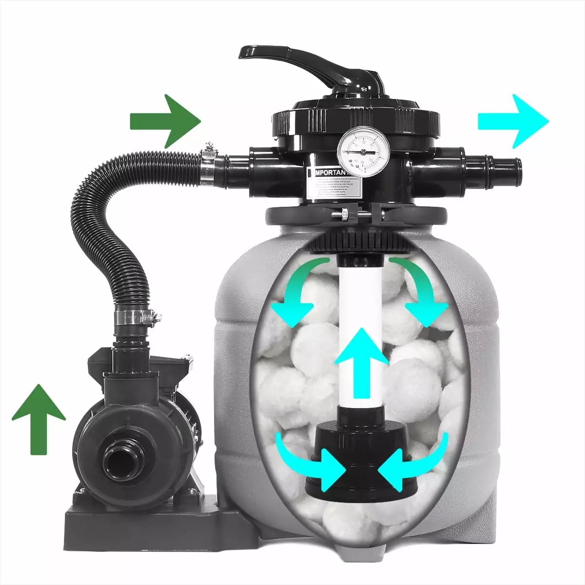- Multi-Port Filter – Multi port provides for easy use and quick back-washing