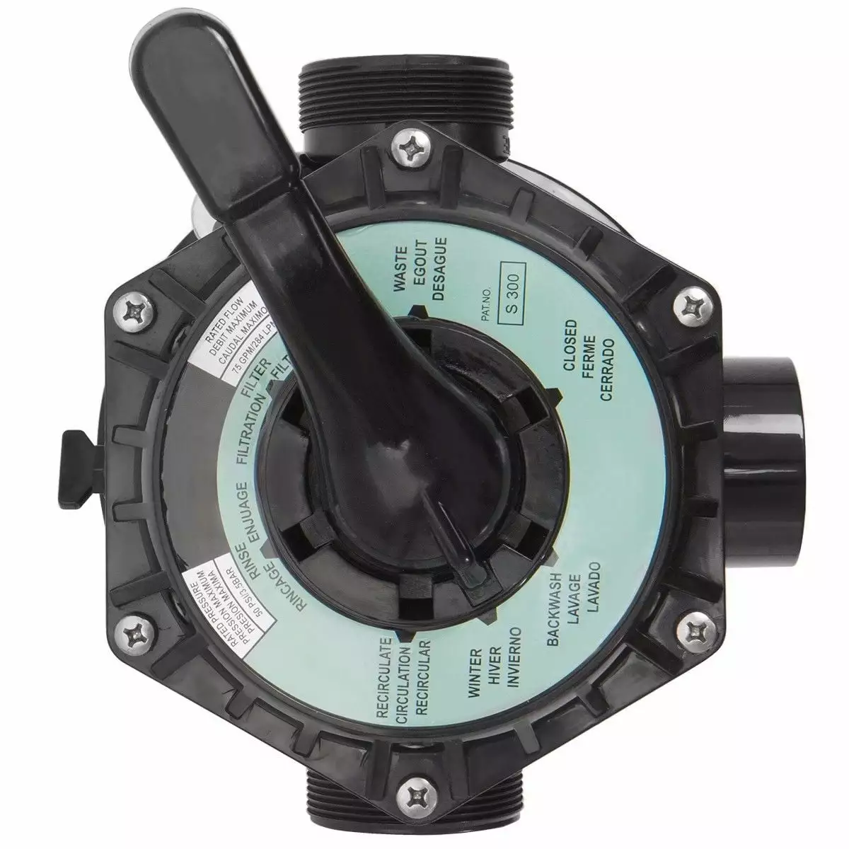 - 7 Way multi port provides for easy use and quick back-washing (Filter. Backwash. Winter. Re-Circulate. Closed. Rinse and Waste)