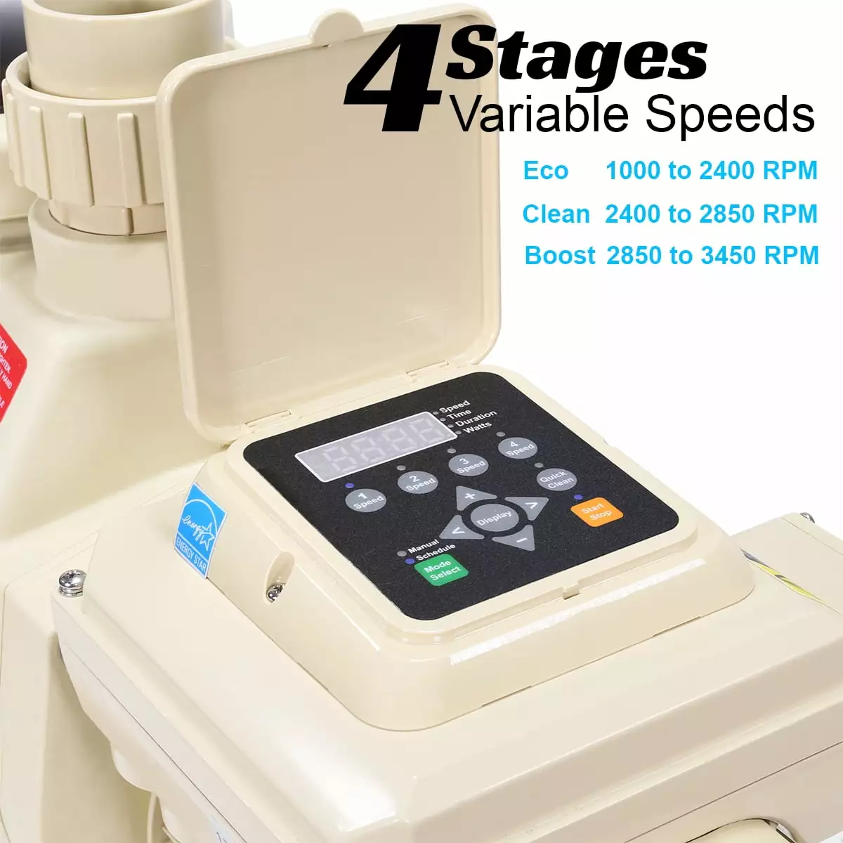 - LCD screen displays actual wattage consumption and speed settings; self-contained 24-hour time clock. with custom speeds and timer functions. which allows it to manage flow throughout the day