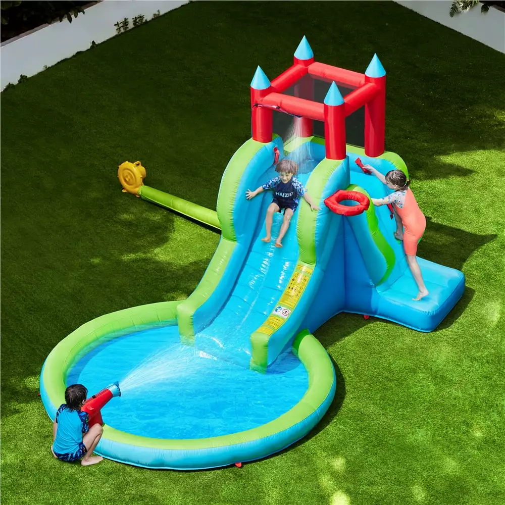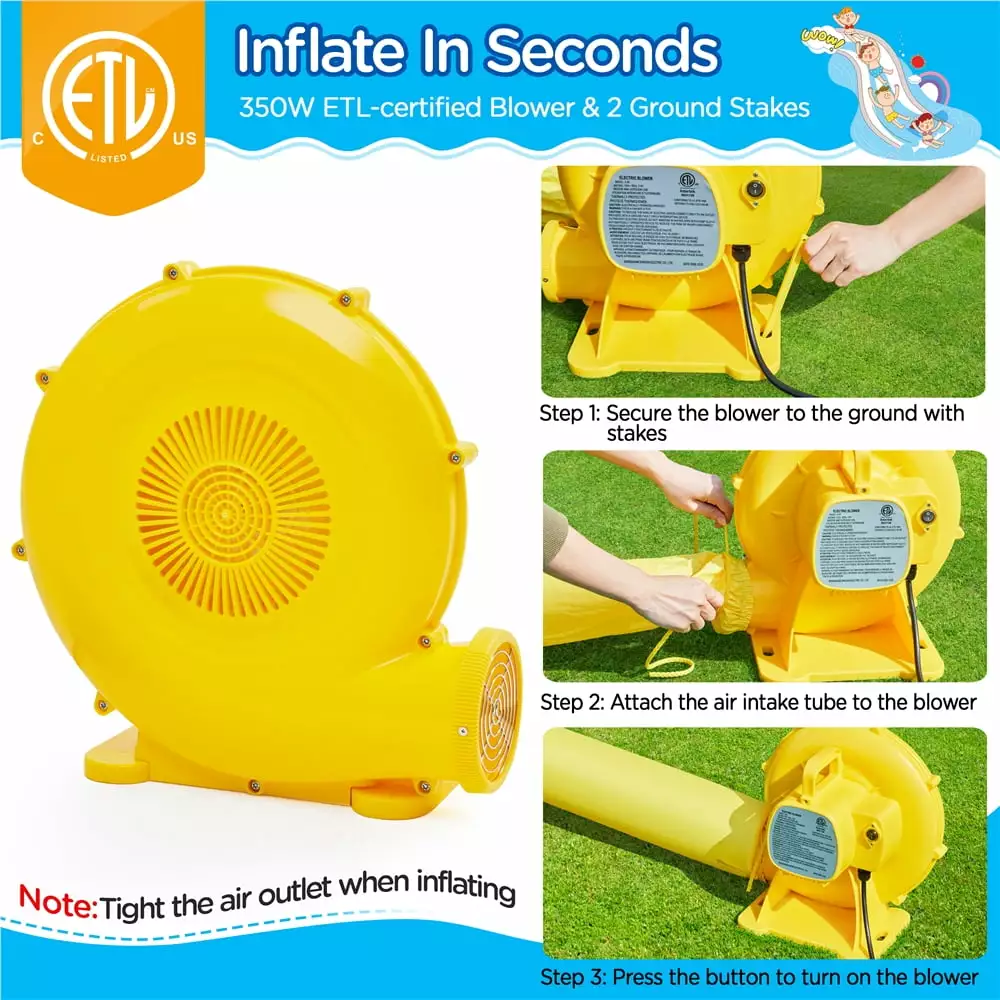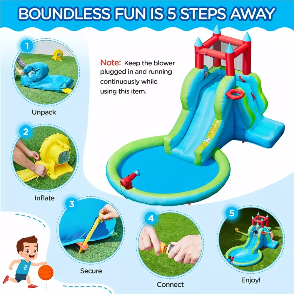 Prepare for endless summer thrills right in your backyard with this 5-in-1 Water Slide! It boasts various exciting activities: a water slide. splash pool. basketball hoop. water cannon. and a challenging climbing wall with footholds. Crafted from wear-resistant PVC-coated 420D and 840D polyester fabric. this water slide combo is effortlessly inflated by a 350W ETL-certified air blower. ensuring quick and safe setup in under 2 minutes. With dimensions of 13?? L ?? 8?? W ?? 7.5?? H. it comfortably accommodates up to 2 kids aged 3 to 8. each with a maximum weight of 99 lb. For added convenience. the set includes the water slide. an ETL-certified blower. a handy storage bag. an inflatable basketball. a water hose kit. a repair patch kit. and 8 ground anchors.